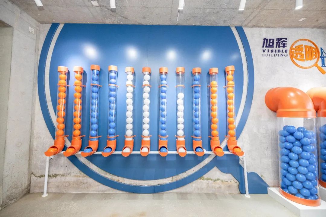 除了轻工业风和多彩颜色的碰撞,为了让客户更好的理解房屋建造,旭辉透明工厂还增加了许多精致好玩的艺术化装置,让体验之旅更具互动性与趣味性。