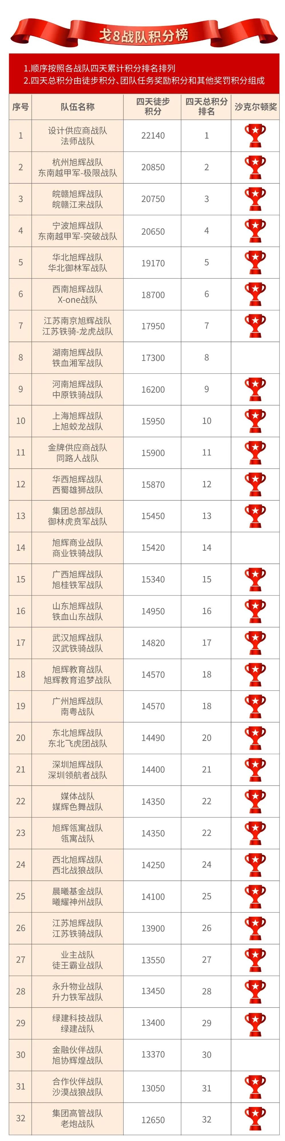 本次徒步赛中,法师战队(设计供应商战队)、东南越甲军-极限战队(杭州旭辉战队)、皖赣江来战队(皖赣旭辉战队)荣获前三甲,包含前三甲在内的29只队伍获得了“沙克尔顿奖”。