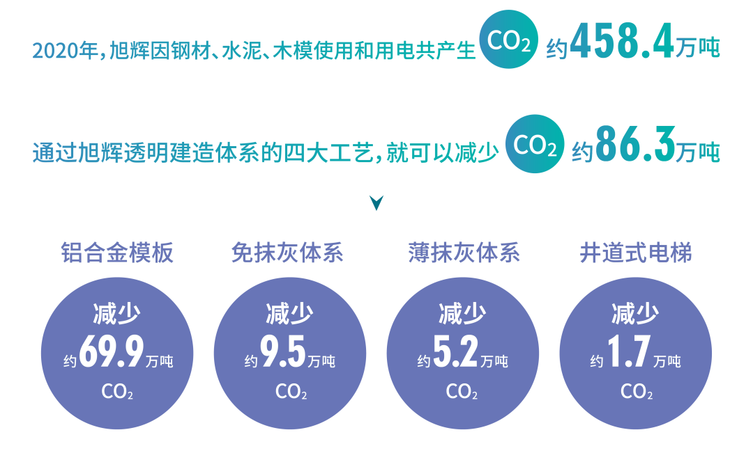 据统计,2020年全年,旭辉因钢材、水泥、木模使用和用电产生的CO₂排放总量约为458.4万吨。其中通过旭辉透明建造体系的四大工艺——铝合金模板、免抹灰体系、薄抹灰体系、井道式电梯,就可以减少CO₂排放量约86.3万吨。