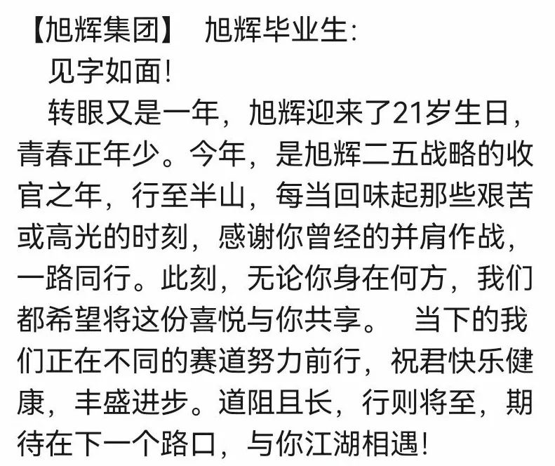 对于从旭辉光荣毕业的离职员工,旭辉也依然与其保持着良好的互动,如同家人一般,定期发送“来自娘家的问候”。今年司庆之际,一条短信刷屏朋友圈,毕业生们深切感受到,“老东家很重视人才,很人性化!”因为我们关心毕业的“你”在外面过得好不好。