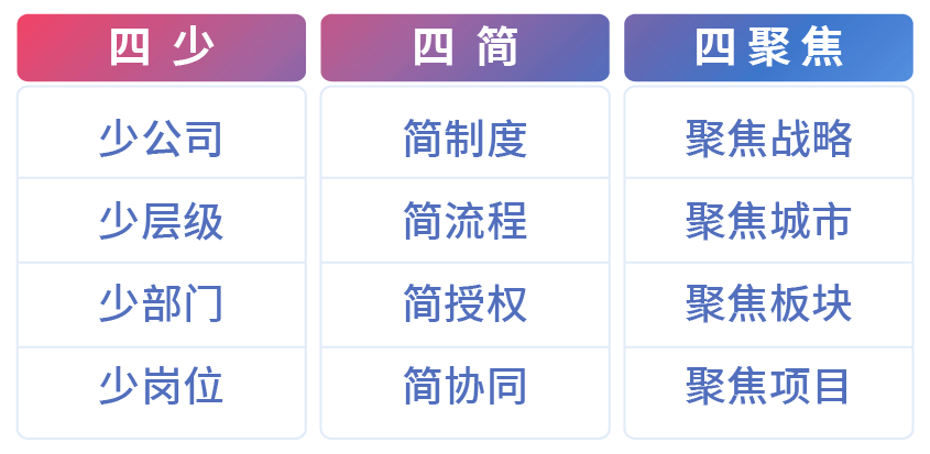 此次组织变革,旭辉围绕“四少、四简、四聚焦”,打造更“精简高效”的组织,让组织设置回归合理,组织效能得以提升。