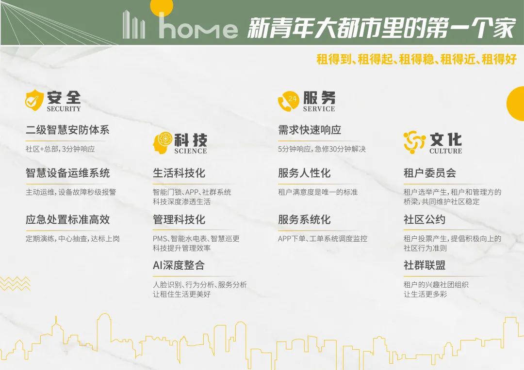 作为行业内拥有最多租赁社区项目的企业之一,旭辉瓴寓凭借丰富的管理经验和成功的实践案例,赢得政府、企业等合作方的青睐和认可。旭辉瓴寓从安全、科技、服务、文化四大维度,探索出一套更适合新市民、青年人的社区体系,以精细化的运营服务力为租户缔造拥有高品质居住功能、充满社区活力的生活方式。