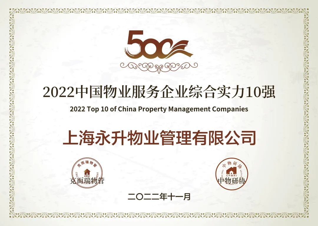 2022中国物业服务企业综合实力TOP10证书