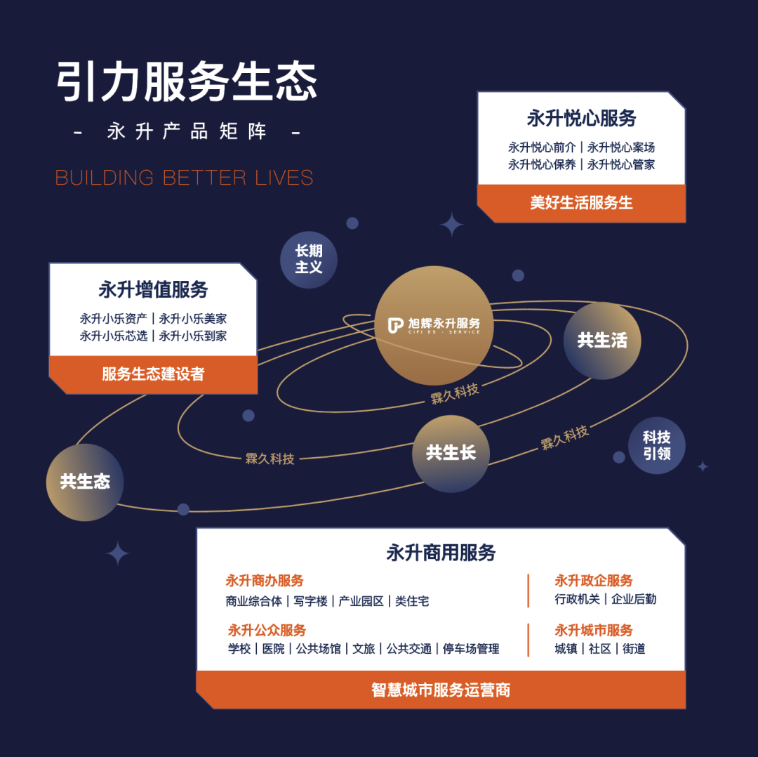 成立20年来,旭辉永升服务始终追求为客户提供更美好的生活,在“平台+生态”发展战略的引领下,坚持“长期主义”和“科技引领”,基于业主需求和市场的变化,旭辉永升服务前瞻性地升级和完善服务产品,在发展之路锻造出体系化服务产品矩阵:“引力生态服务系统”,基于社区服务、商用服务、增值服务、智慧服务等四大类服务,专业深耕住宅、商业、园区、办公楼、学校、医院、展馆、文旅、交通枢纽、城市服务等十大业态,实现城市全空间、空间全周期的综合服务。