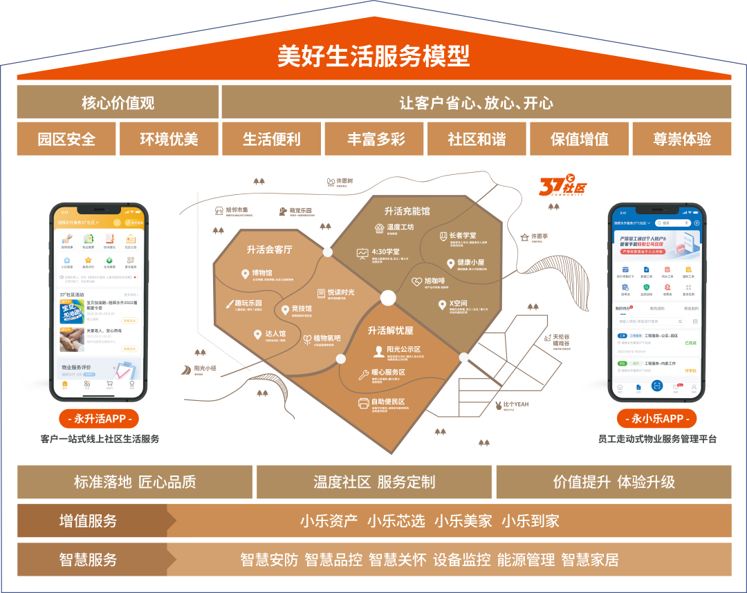 基于“用心构筑美好生活”的初心与使命,20年来,旭辉永升服务持续打磨服务产品与内容,从多方客户的需求出发,通过系统性研究和产品开发,打造专业、专精、高品质的服务体系,围绕客户“园区安全、环境优美、生活便利、丰富多彩、社区和谐、保值增值、尊崇体验”的7层体验感受,用心打造有温度的37℃社区和有特色的社区文化,致力于成为“美好生活服务生”。