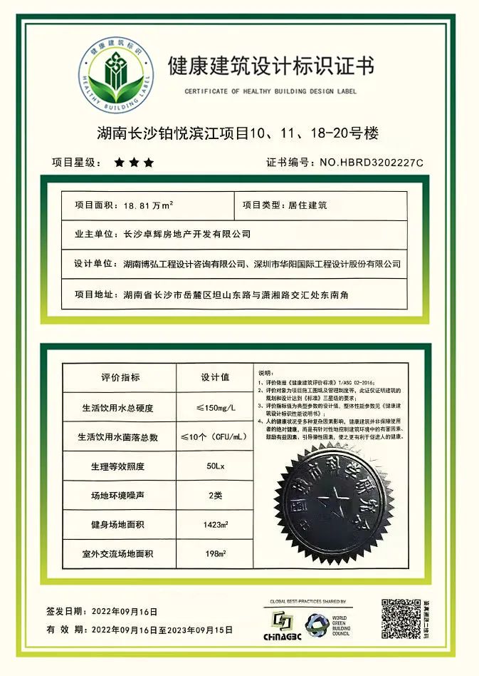 旭辉铂悦湘江采用水质监测系统、室内空气质量监测、空气净化装置、室内外健身场所及设施、丰富的老年人及儿童活动场所、医疗服务及紧急救援设施等几大健康建筑技术措施,为业主提供更健康的环境、设施和服务。