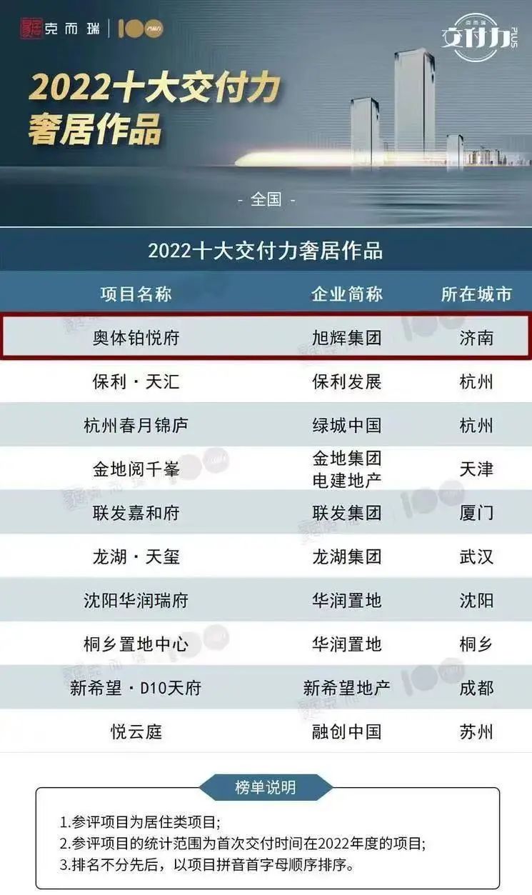 济南奥体铂悦府荣登克而瑞“2022十大交付力奢居作品”榜