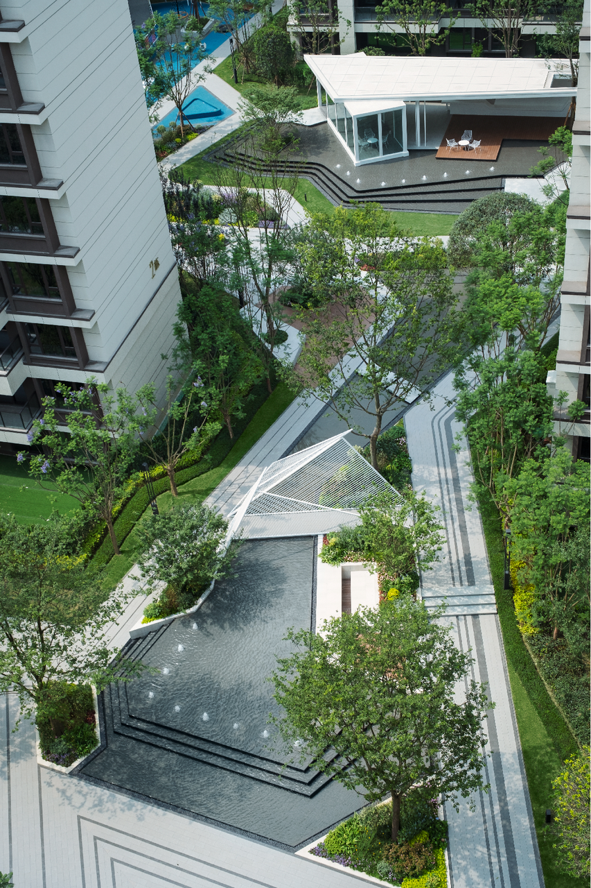 第一批苗木进场时,设计师发现有60余棵不合格,于是在和施工单位协商后坚决清退,并在后期做到苗木100%实地号苗,务求所有苗木的选型、观感达到极致,这也使奥体铂悦府的景观园林享誉片区。