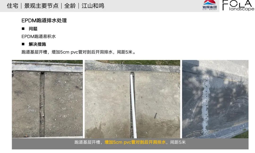 针对社区内的排水问题,二期增加了建筑旁的排水沟;针对主入口的幕墙对缝,二期精心测量并修改了宽度,使观感、功能俱佳;针对儿童活动场地和全龄塑胶跑道,二期做成EPDM塑胶面,增加排水口设置,避免积水造成的脱胶、起皮,保障儿童老人活动安全……