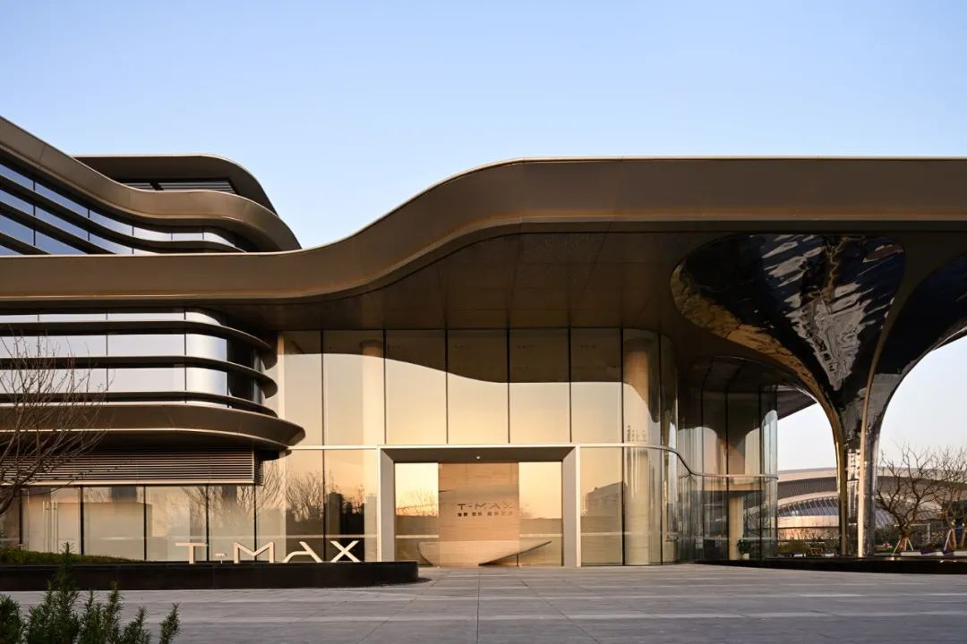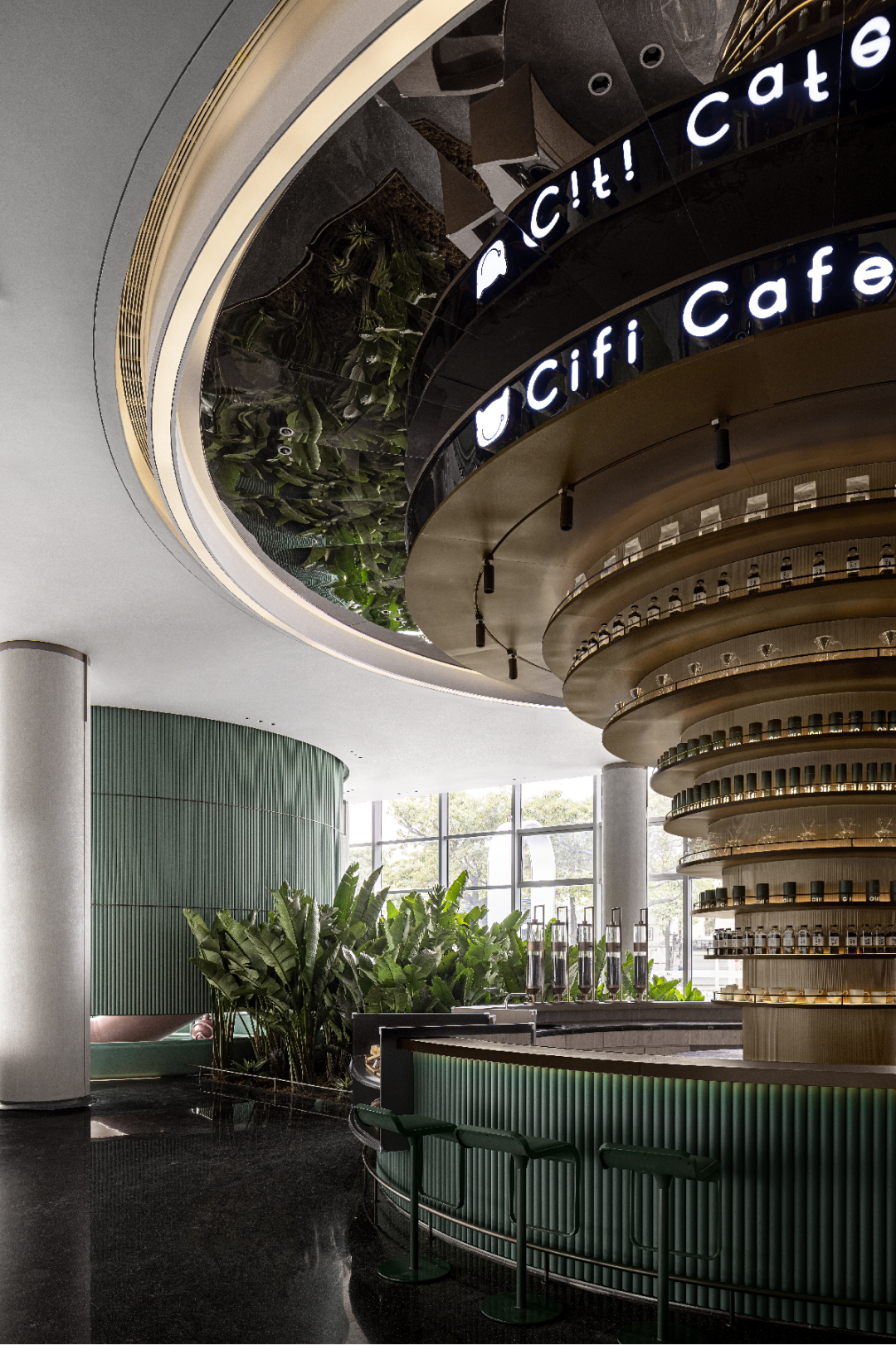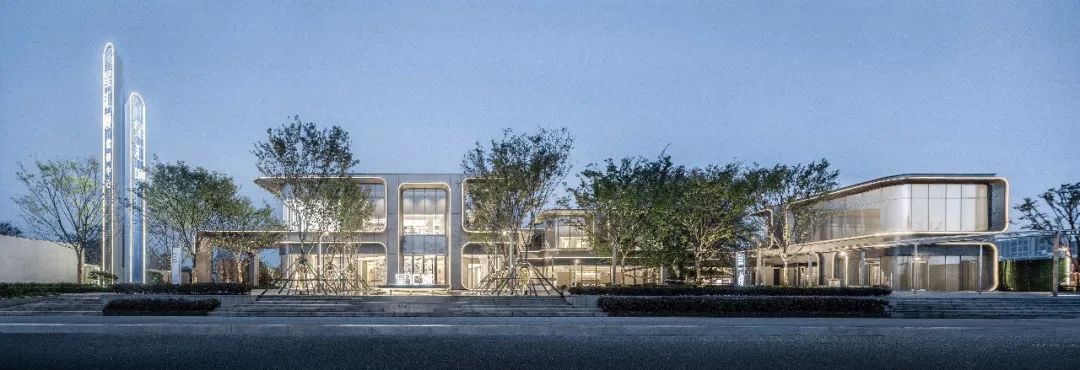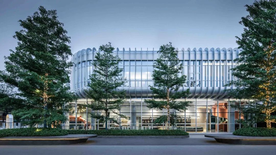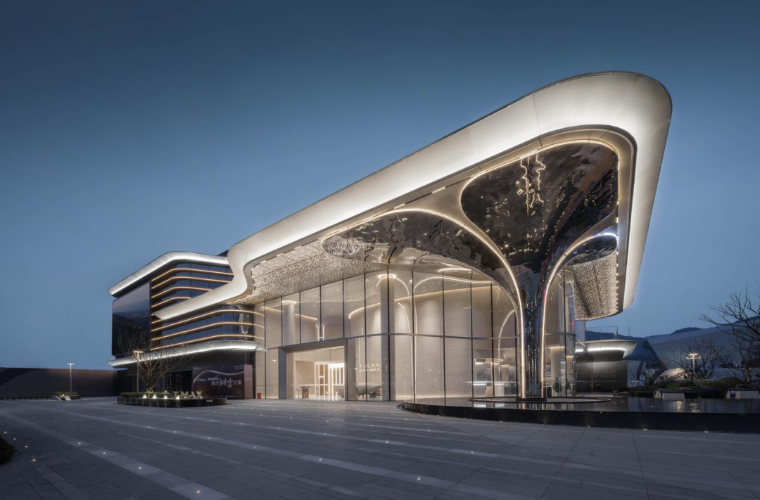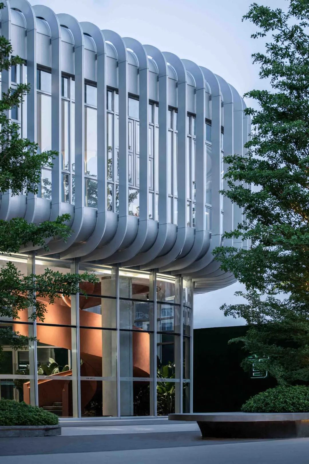 现代、简约、时尚的建筑形体,以“C调叠韵”的艺术化曲线,使其富于美感,结合星光露台、星空吊顶、悬挑的檐口,纯净的玻璃幕墙一同映射出古树斑驳的倒影,体现出场所诗意般的精神。