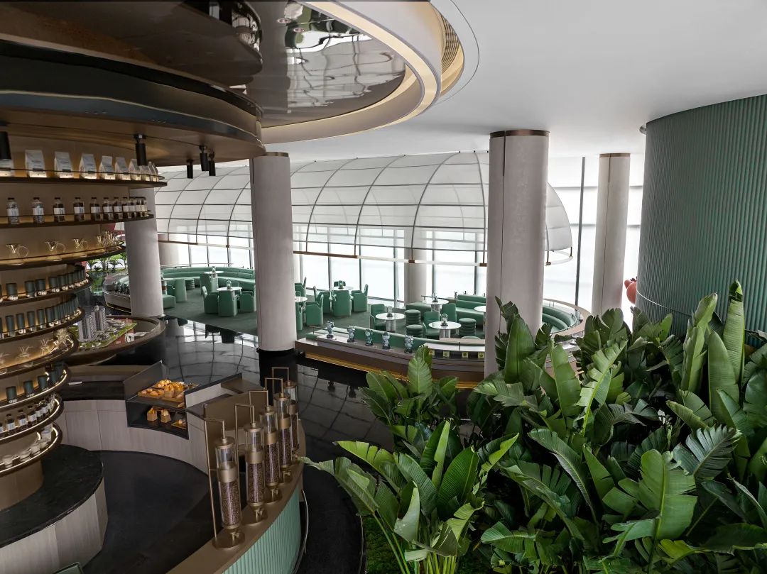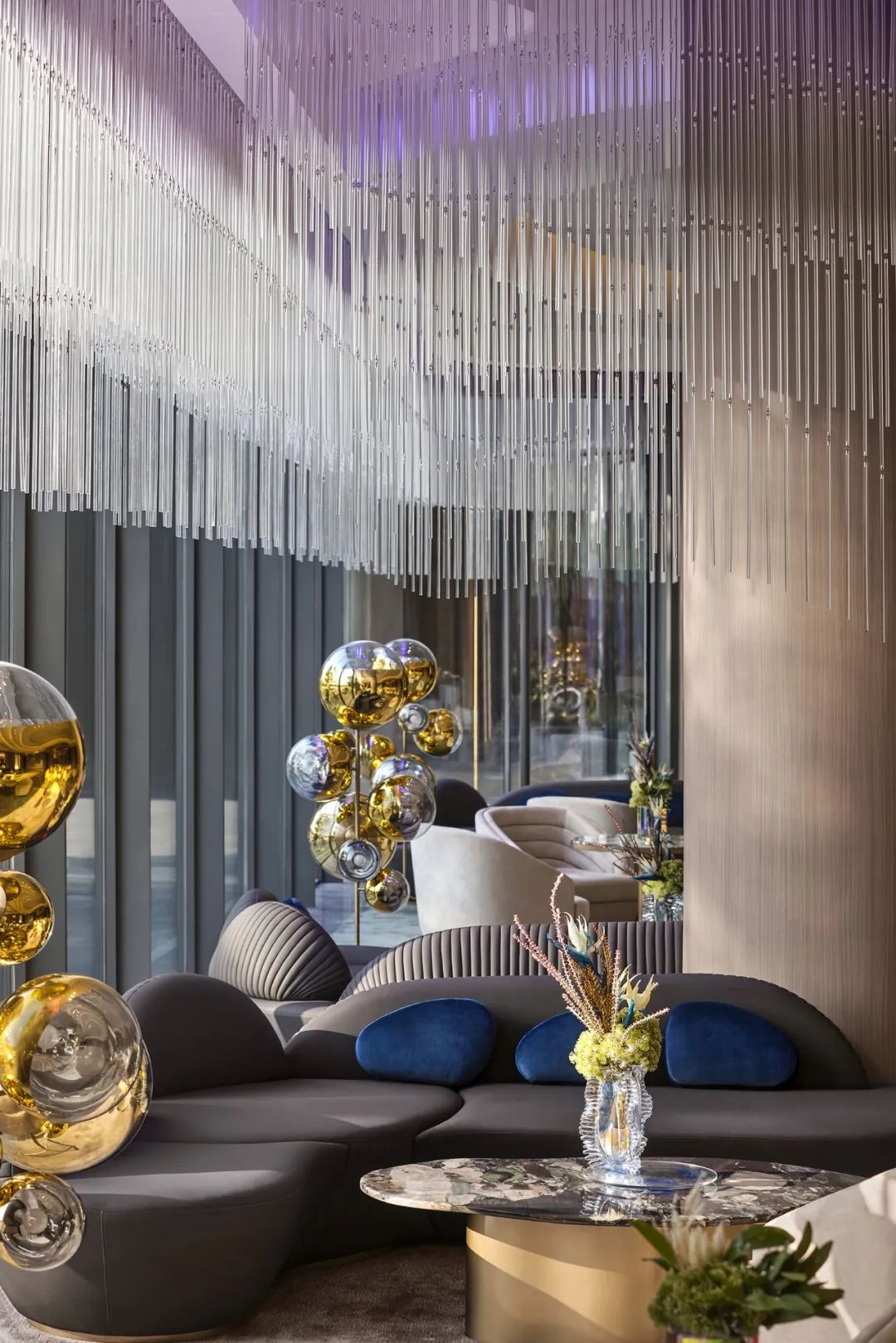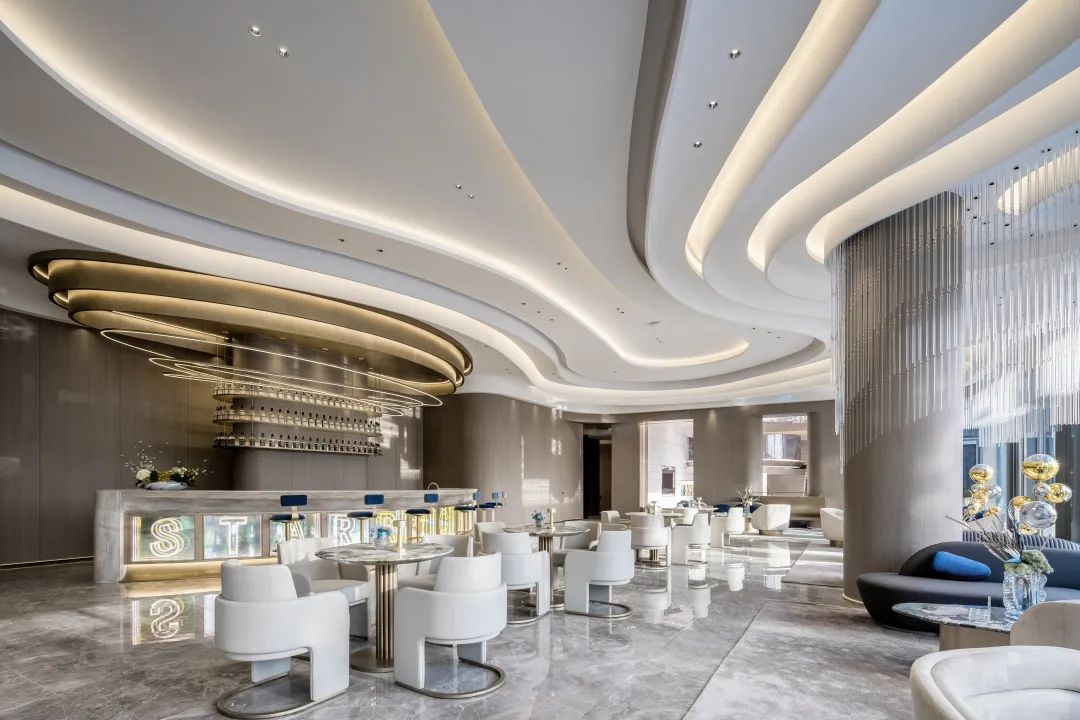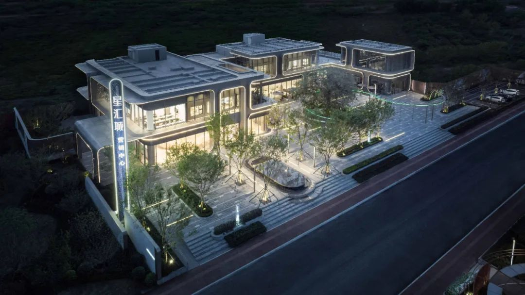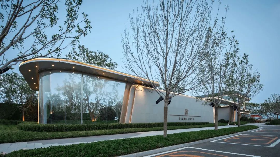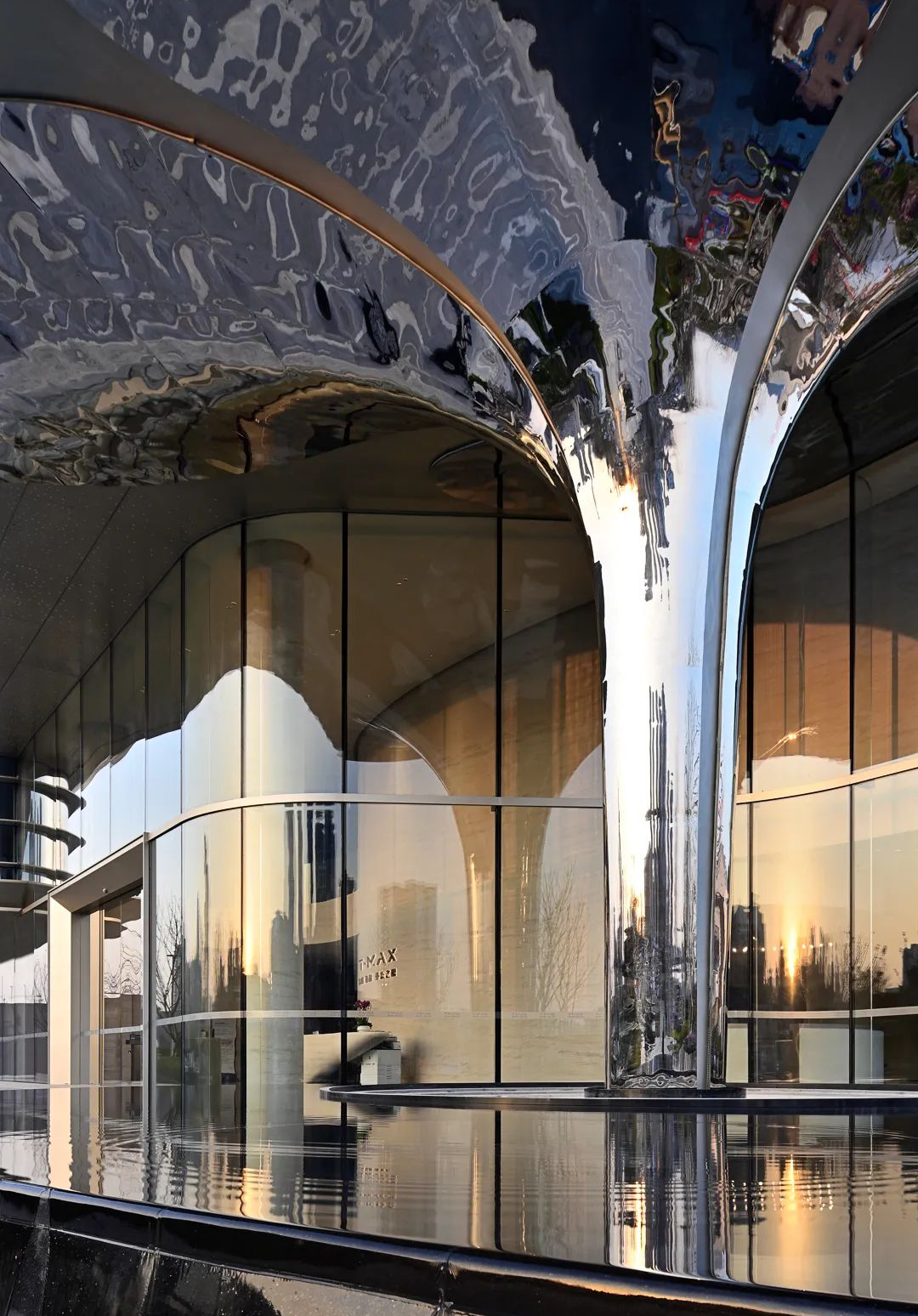现代、简约、时尚的建筑形体,以“C调叠韵”的艺术化曲线,使其富于美感,结合星光露台、星空吊顶、悬挑的檐口,纯净的玻璃幕墙一同映射出古树斑驳的倒影,体现出场所诗意般的精神。