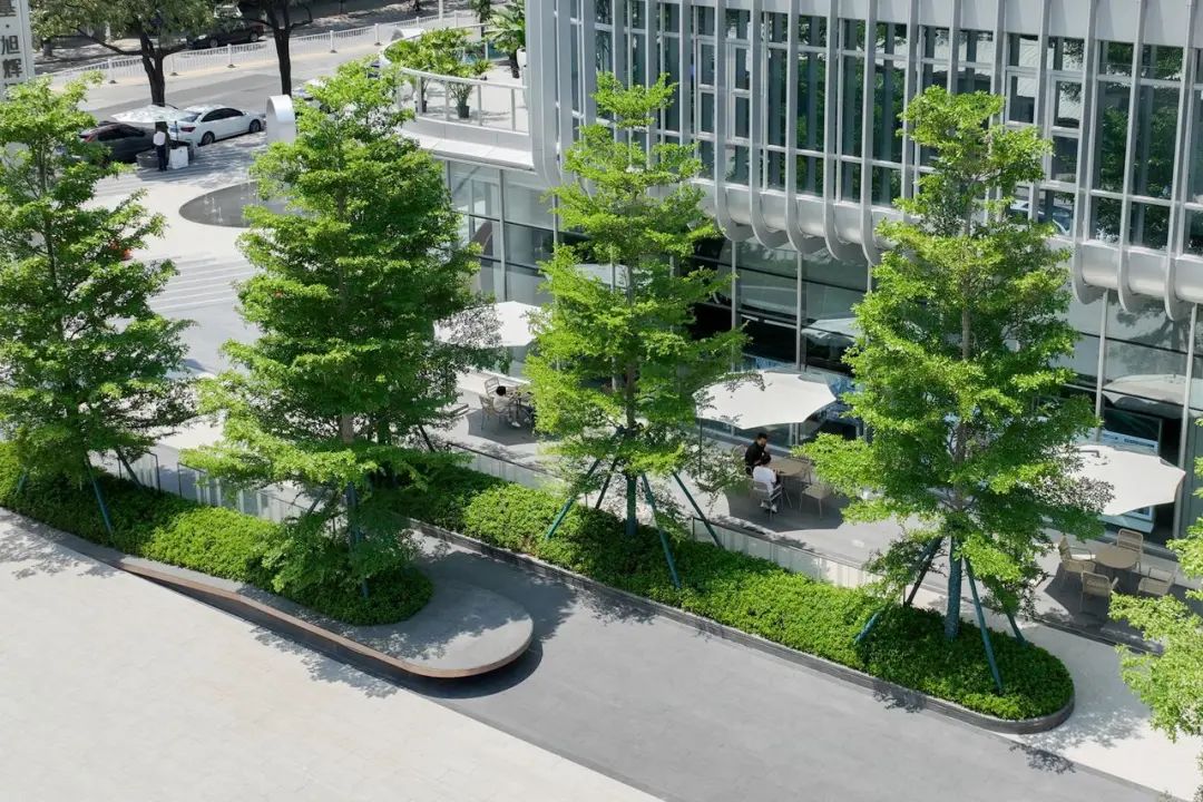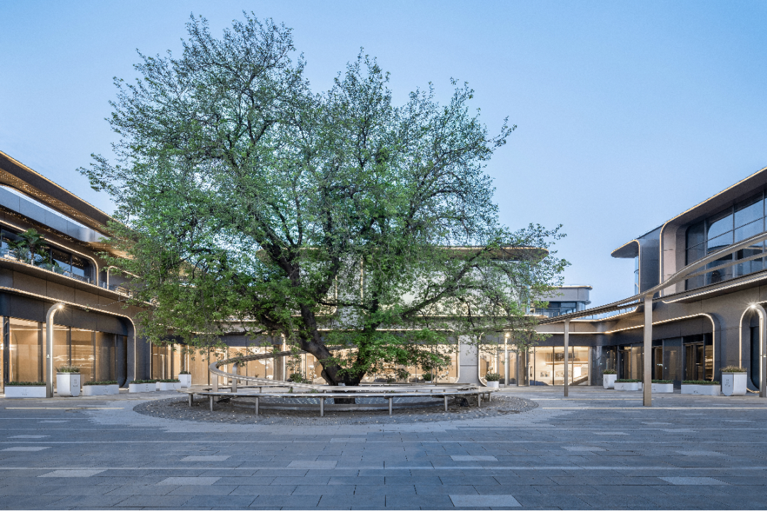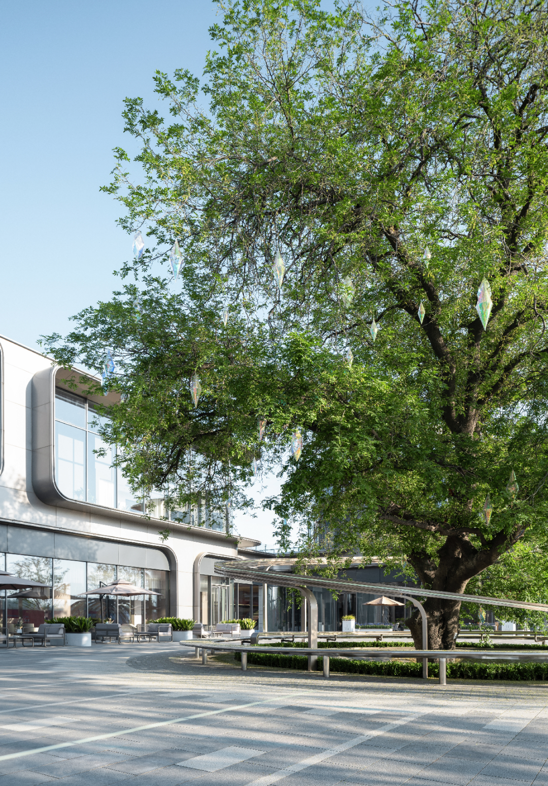 临沂星汇城示范区围绕古树广场建造,原址小白庄村内有一棵百年历史的皂角古树,根深枝茂、古木参天,时光流转、沧海桑田。设计将其保留,实现了百年古树与蓬勃发展的街区的文化共生,古树真正成为了历史记忆的传承者,和时光跃迁的见证者。而这也正是旭辉产品“点滴之处,可见用心”的体现。