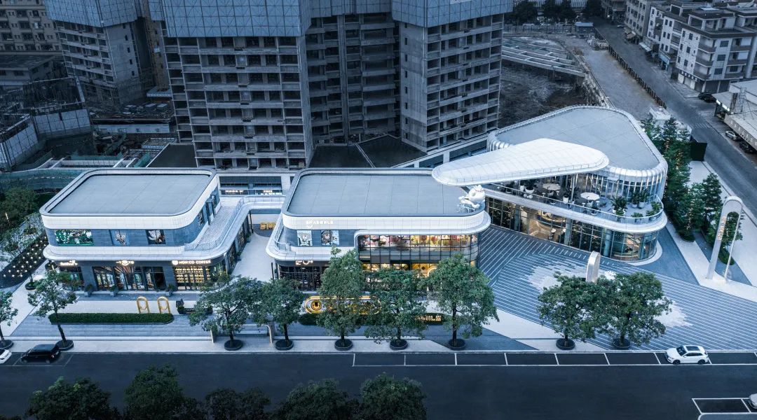 兼具生活体验性与外观艺术性,东莞江山外街以低饱和度配色为主,结合银色铝板弧形线条,错动变化,交织出外立面富有韵律的节奏关系。内街设置内退广场,将客流导入到内街,为内街商铺增加展示面和客流可达性。