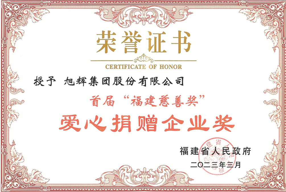 首届“福建慈善奖”于2021年年底设立,评选范围及对象包含2019年1月1日至2021年12月31日,在福建省慈善事业中发挥重要作用、作出积极贡献的先进个人、项目和单位,是福建慈善领域最高奖项。本届共授予78个爱心个人、单位和项目“福建慈善奖”。其中,爱心慈善楷模奖9个、优秀慈善项目(慈善信托)奖20个、爱心捐赠企业(机构)奖17个、爱心捐赠个人奖17个、优秀慈善组织奖15个。与旭辉一同荣获“爱心捐赠企业(机构)奖”表彰的还有宁德时代、盼盼食品、三棵树等知名企业。