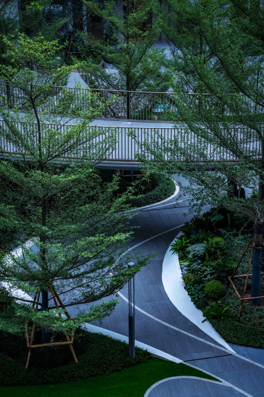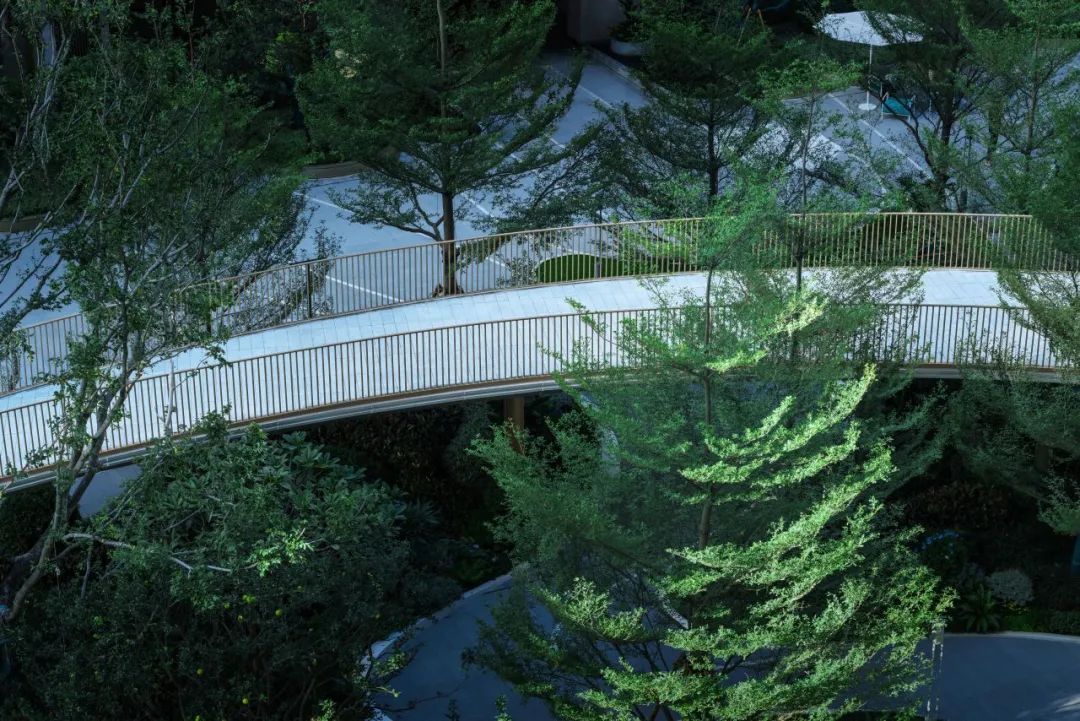 从进入社区开始,入口处的连羽廊、叠水石、绿植墙等营造出海浪与森林相融合的诗意体验。随着脚步的深入,社区内以“浮羽花园”为主体,打造可以上下穿梭的“穿羽廊”,形成具有独特体验的社交休闲空间。