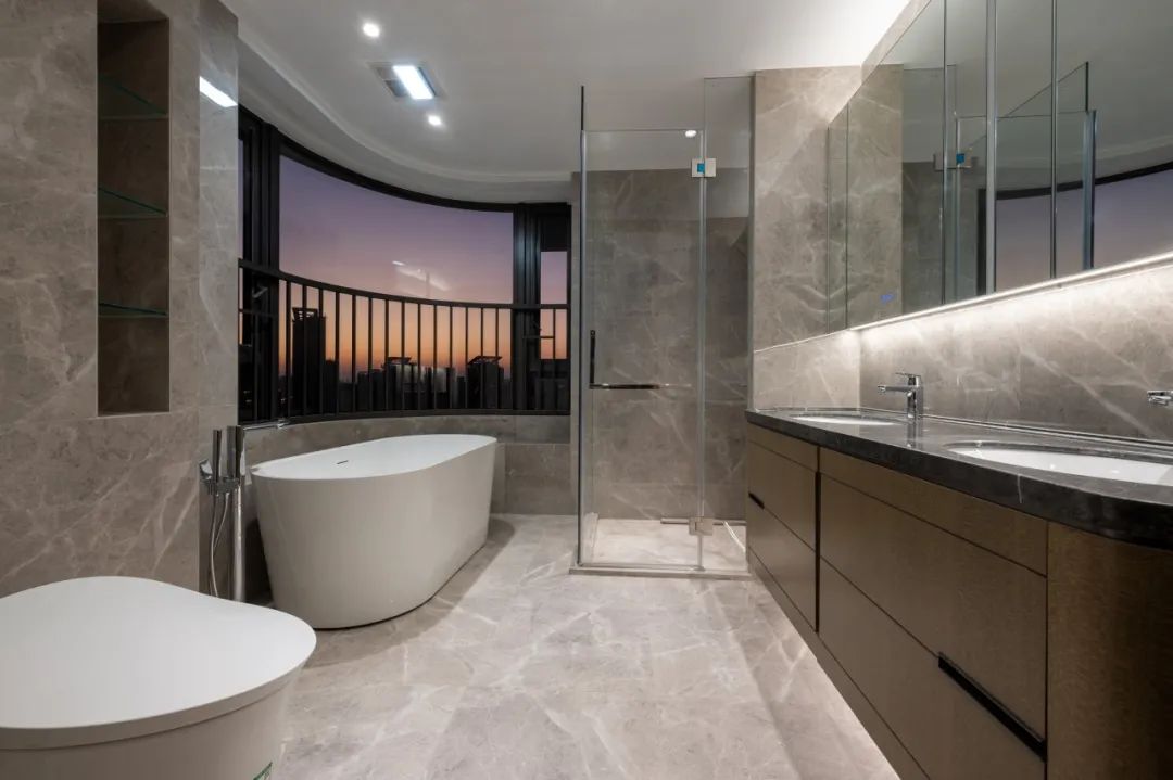 步入室内,建筑面积约210㎡的户型打造了约60m²的巨厅,双面大落地窗带来全新视觉体验。主卧与主卫270°弧形转角飘窗,带来更佳的采光与景观视野。此外,整体中入式布局结合双洄游动线,打破空间的限制,展现了高端改善大平层的舒适与尊贵。