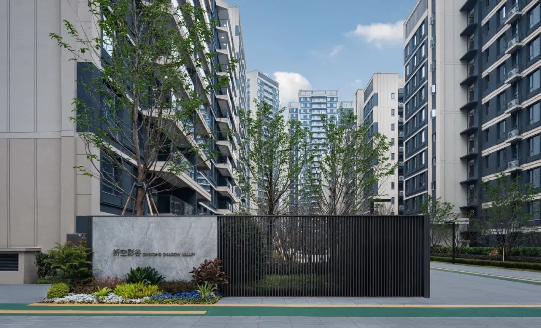 进入大门后的第一个核心景观——4排规整的乌桕树阵,由景观设计团队历时40多天、跑了数个城市觅得52棵胸径在20cm左右的优质树种。因乌桕树枝干苍劲,不同季节树叶颜色的多样变换,每每漫步园境,即能感受“一叶落而知秋”的意境。