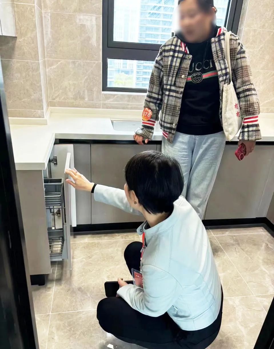 2024年“聆听行动”中,为了以更充足的服务人员、给予客户更贴心的交付体验,管理层及员工纷纷来到各地交付现场,作为“验房大使”一对一接待客户。不仅亲自上手演示新家的“使用说明”,还负责跟进联络维修团队,记录下业主的反馈并拍照打卡上传,确保反馈都能及时得到改进和解决。