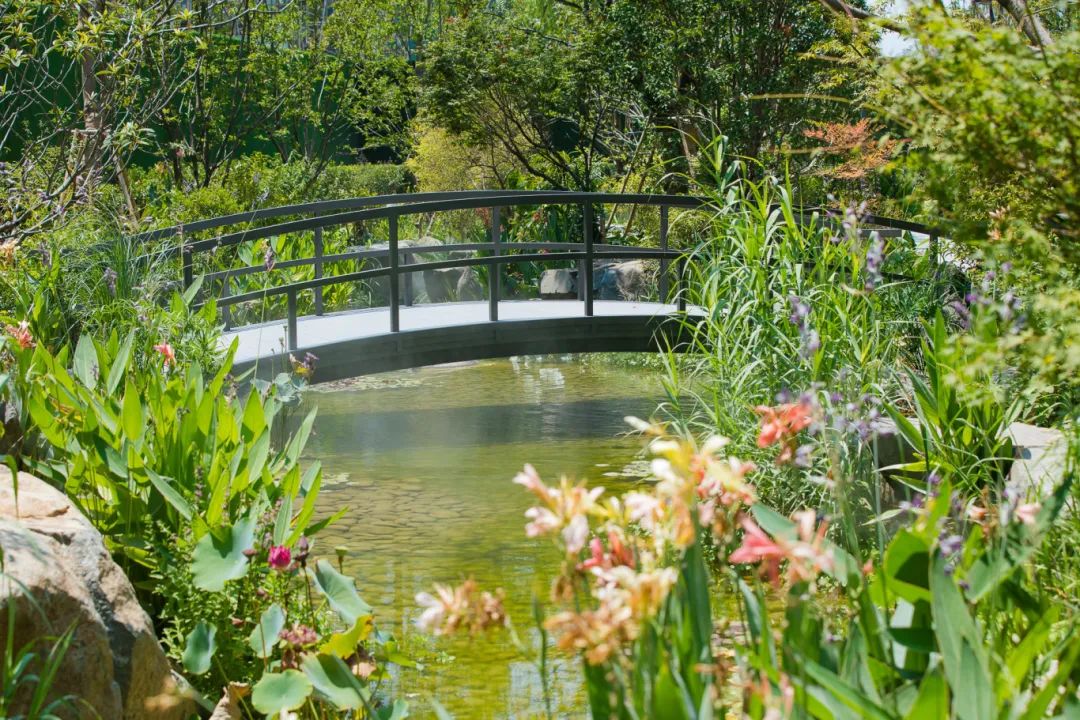 为此,项目将植物配置、竖向地形、铺装材料进行整合与拉通,确保海绵理念与景观空间无缝衔接,达到整体而有机的呈现。尤其在植物配置时,旭辉铂悦溪上植物配植时更充分考虑花期、色彩、形态、质地、季相等的搭配,实现花镜植物、常规植物、水生植物的复合种植,保证雨水花园的观赏性。
