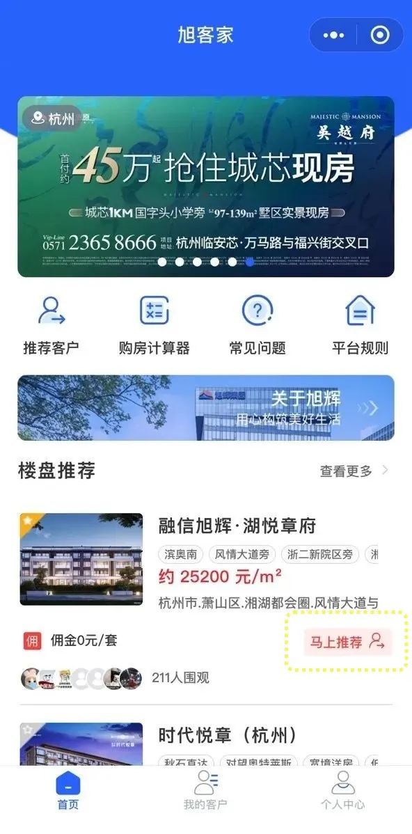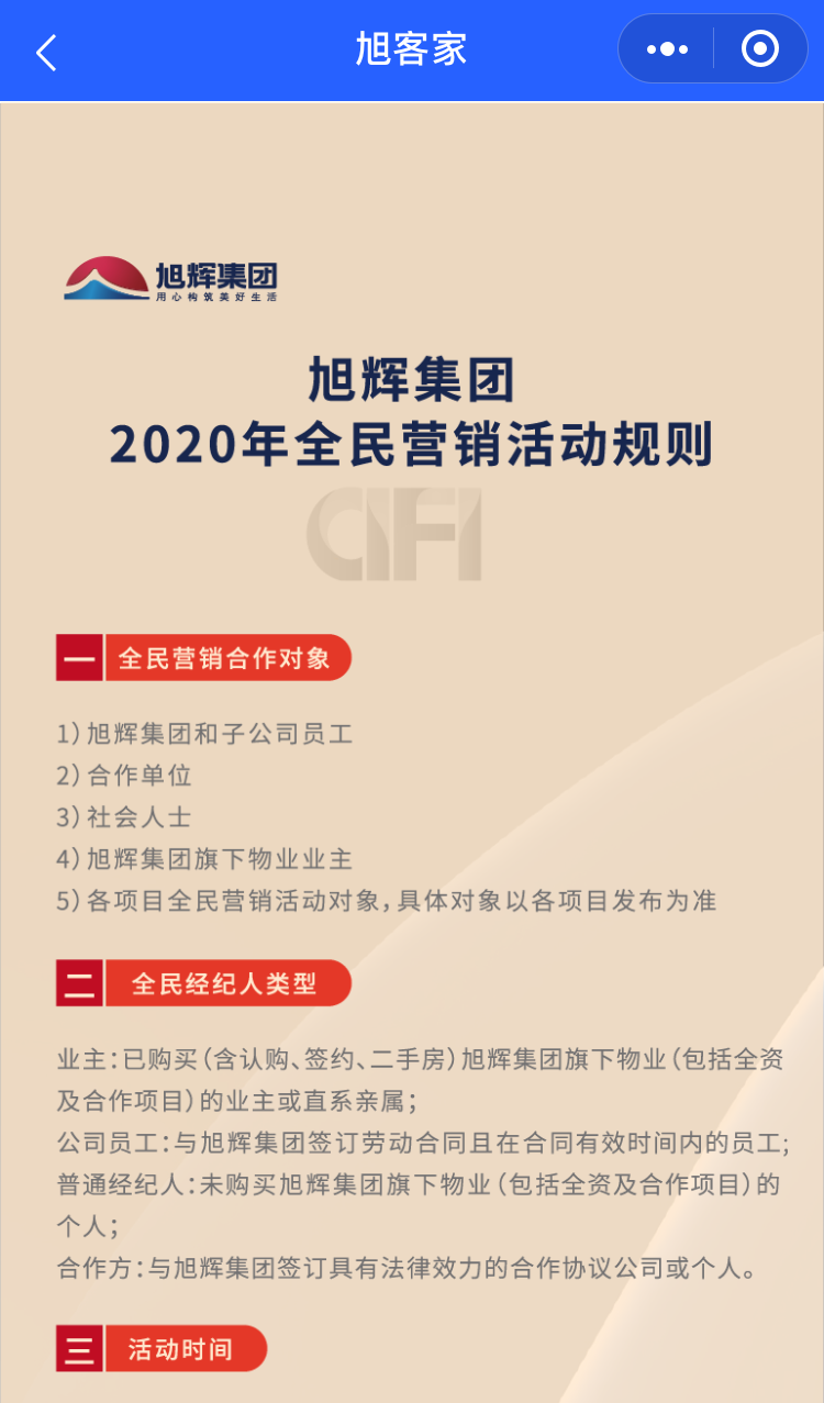 2020旭辉全民营销活动已经上线!截止当前,旭客家的新访问人数和注册经纪人数均已超2万人。即刻完善资料成为旭辉经纪人!推荐客户成功,即可获取佣金结算或奖励政策(具体结算标准以项目发布为准)。