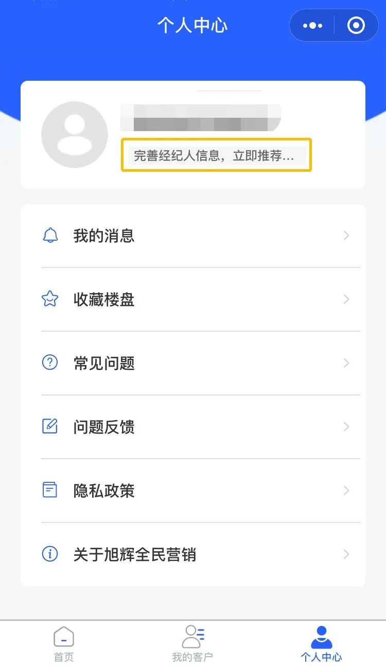 点击进入个人中心,填写经纪人信息,不同身份类型由你切换或选择,完善身份信息后,即可成为2020旭辉经纪人,将好房分享,更能开始客户推荐,赚取佣金。
