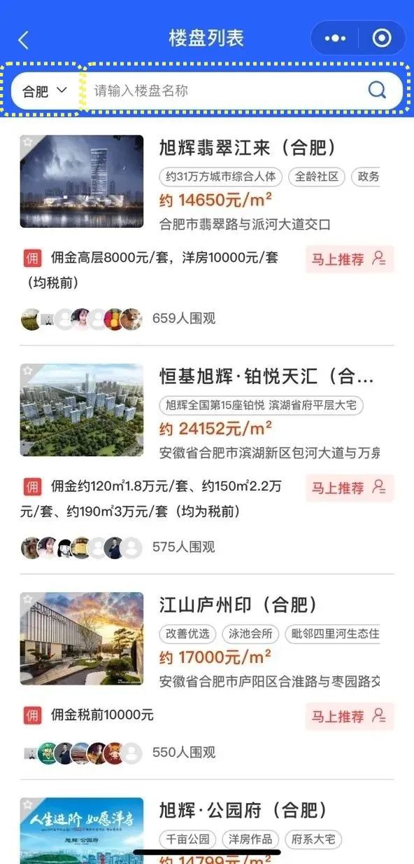 进入旭客家小程序首页,即可阅览推荐楼盘。没有找到那个心仪的款?点击楼盘推荐>查看更多,选择目标城市,输入项目案名,动动手指,快速查询。