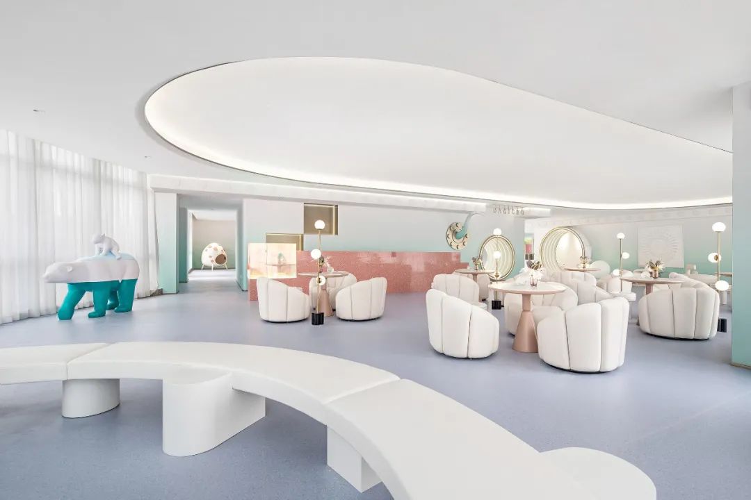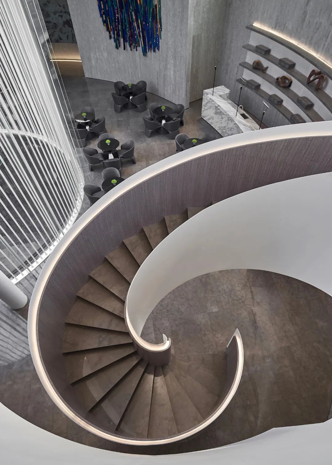 接待区与水吧区采用开放式景观楼梯设计,令人联想到水中漩涡,赋予一种圆融、绵延、源源不绝的视觉感受。地砖光泽与墙面相互辉映,去除不必要的陈设扰动空间通透性,阳光与微风自然充盈整个空间。