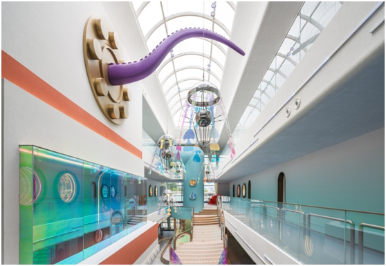 辉盛岚海将教育引导融入设计,分别从社会角度、儿童角度出发,进行空间和模块的设计与打造。具有卡通章鱼标识的售楼处萌力十足,通过塑造无边界的教育、无边界的想象力和无边界的空间,拓展人与自身、人与社会、人与自然无边界的关系。同时,借助色彩3D王国、分龄主题王国和自然科学王国的设置,为儿童建立梦幻而又奇趣的“梦想王国”。