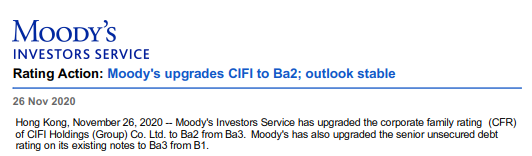 11月26日,国际三大评级机构之一穆迪(Moody’s)发表报告称,预计旭辉控股在未来12-18个月将继续表现出强劲的收入增长和可控的债务规模,叠加考虑公司良好的流动性、不断扩大的销售规模和多元化发展前景,决定将旭辉控股的企业家族评级(CFR)从“Ba3”调升至“Ba2”。同时,穆迪也将旭辉控股现有票据的高级无担保债务评级从B1上调至Ba3,展望稳定。