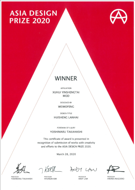 在2020“A’ design Award&Competition” 德国A’设计大奖评选中,烟台的辉盛岚海荣获“Interior Space and Exhibition Design”(室内空间与展览设计)类别金奖。其实,这已经不是该项目获得的第一项殊荣。早在今年的地产设计大奖评选中,辉盛岚海就凭借出色的表现赢得了地产设计大奖室内设计金奖,近期还荣获又一国内设计大奖——金盘奖的认可。享誉国内之外,辉盛岚海也获得了国际奖项的青睐。在2020“Asia Design Prize”韩国亚洲设计大奖和2020“DNA Paris Design Awards”DNA巴黎设计大奖中,辉盛岚海都捧回室内设计奖奖杯,收获颇丰。