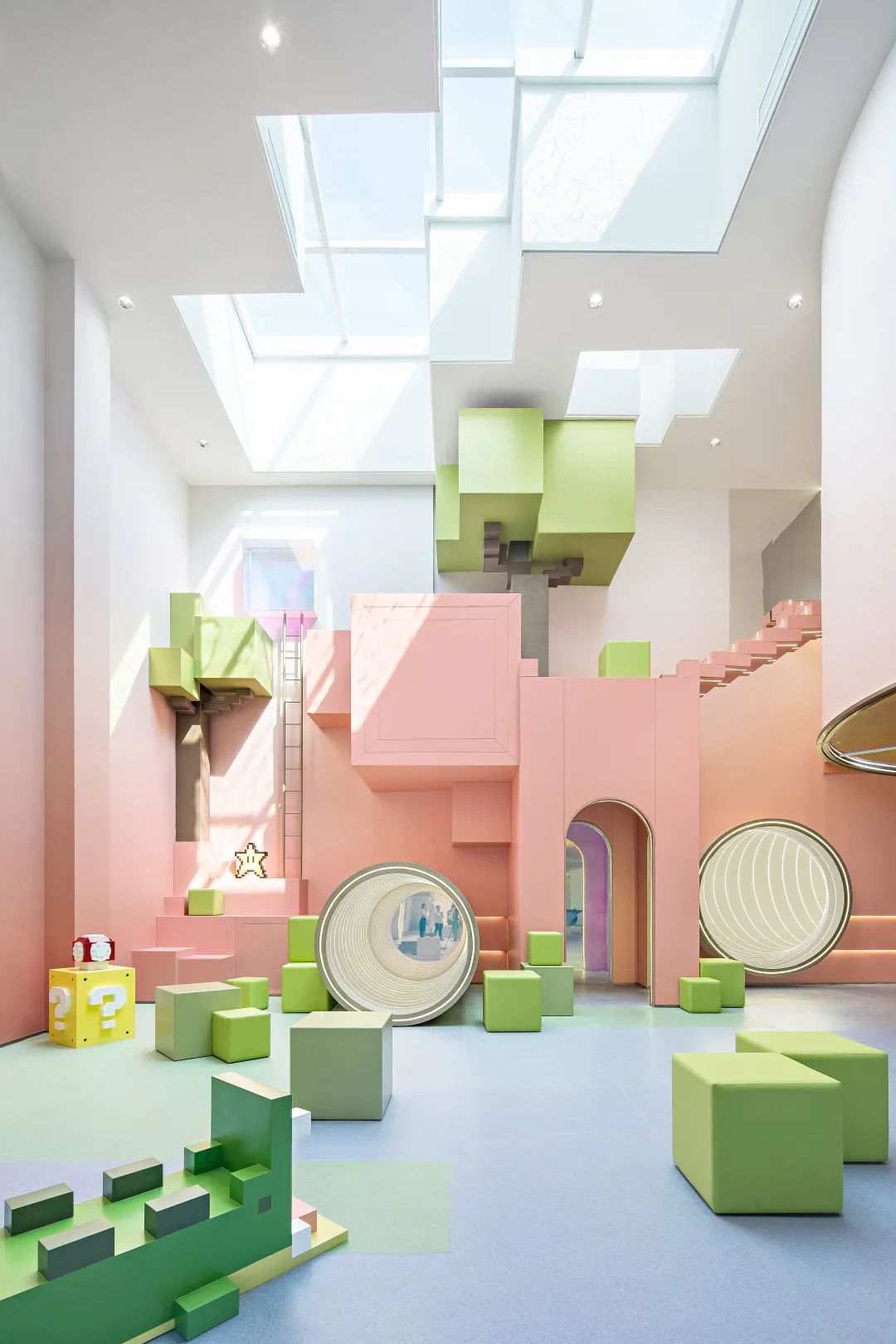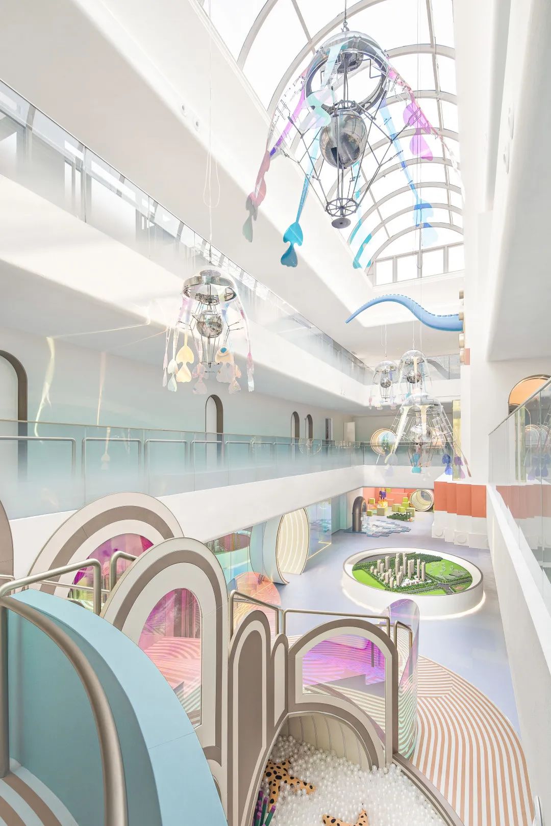 通过光与影、明与暗的设计,辉盛岚海尝试塑造出启发孩子想象力的空间。光线从模块化天窗中洒下,就像染色的色彩流淌在室内空间里,更加凸显线性空间的柔美、灵动,增强了空间的体量感,为整体空间营造出梦幻般的氛围感受。