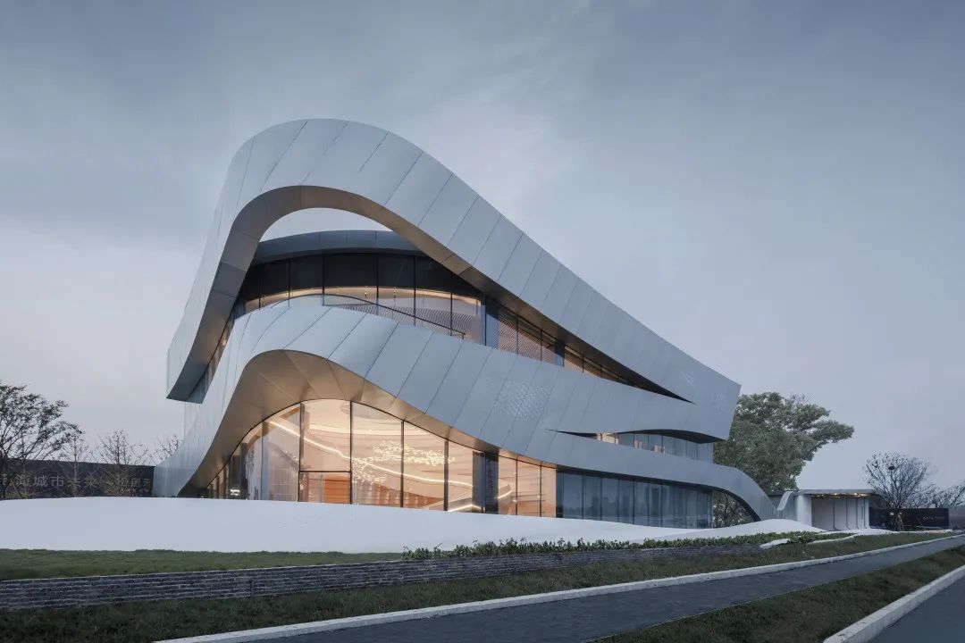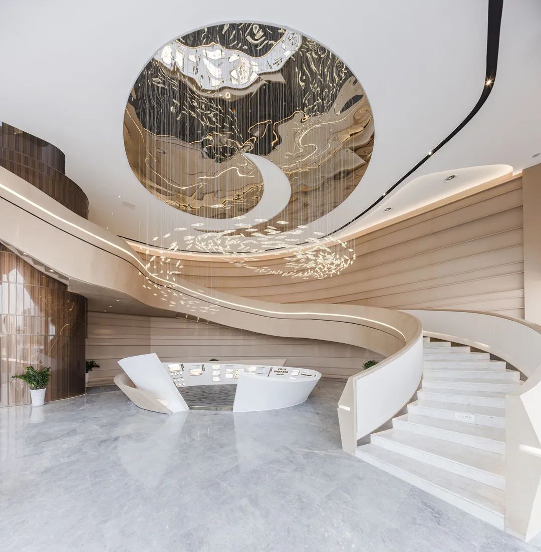 合肥公园天著售楼处,沿用淝河曲线的艺术设计概念,运用几何艺术元素引入到室内空间中,创造一个有序、人文、艺术、富有美学构成的空间。室内空间设计通过简洁而流畅的形体和语言,演绎出现代自然的精髓精华。蜿蜒灵动的旋转楼梯赋予空间未来感,宛如一条绵延婉转的飘带,在视觉上呈现出恢弘的延续性,流动的美感提升了空间的格调。