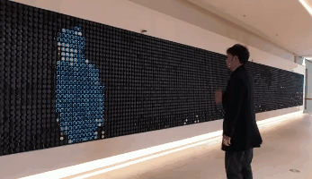 由旭辉商业倾力打造的艺术装置互动墙,位于一层主入口处。互动墙由上万枚金属圆片共同组成,当你向互动墙招手的时候,互动墙也会朝你招手作为回礼。