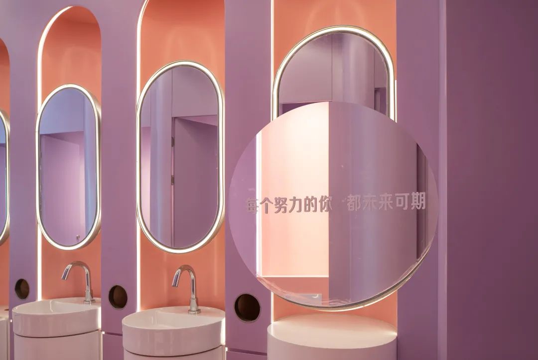 除了充满巧思的空间设计,嘉兴旭辉广场对消费者的关爱也无处不在。位于B1层的卫生间和母婴室不仅具有色彩鲜明的独特视觉效果,卫生间镜面上还设置了暖心标语,让卫生间成为了一间“情绪转换站”,让顾客在进入卫生间的短暂时间里,可以得到视觉和精神上的放松。卫生间动线更采用全程无门设计,通过对空间路线更有效的规划,巧妙地避免视线接触,实现了后疫情时代下,消费者最为需要的零接触体验。