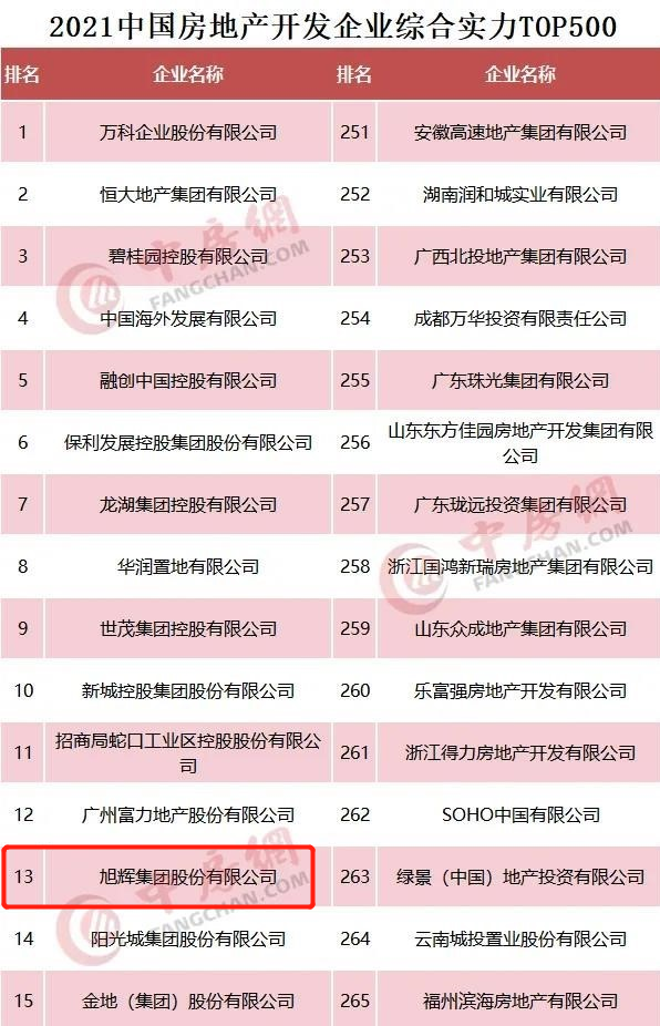 旭辉位列“2021中国房地产开发企业综合实力TOP20”第13位