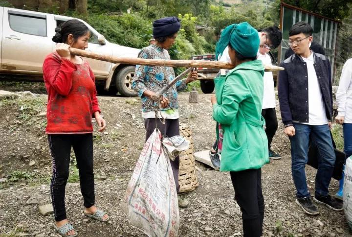 在学校里的捐赠活动结束后,志愿者跟随学生踏着泥泞的山路走回家,与他们深入交谈并赠送生活用品。