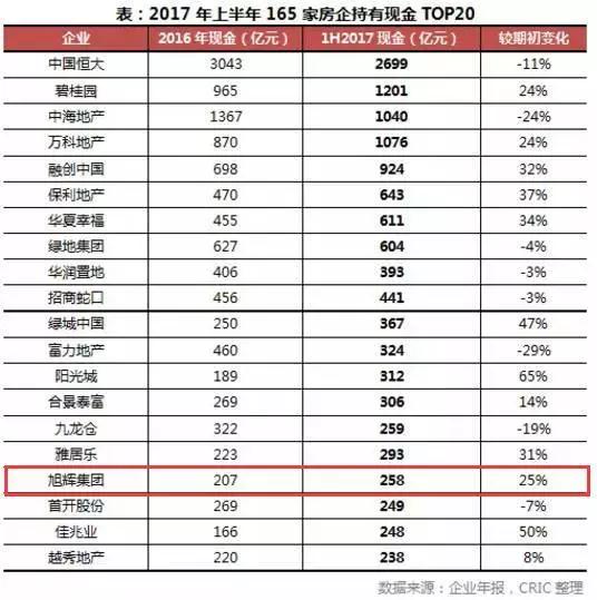 在165家上市房企中,旭辉以258亿元的现金跻身“2017年上半年165家房企持有现金TOP20”榜单,同比增加25%。