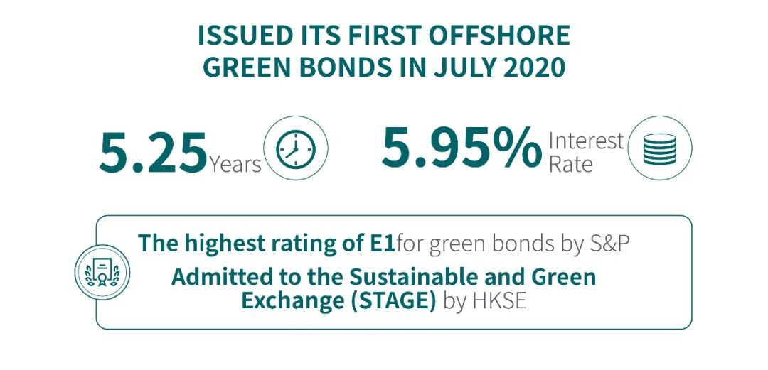 Leveraging its constant breakthroughs in green initiatives, in July 2020, CIFI issued its first offshore green bonds with an aggregate amount of USD 500 million, an interest rate of 5.95%, and a term of 5.25 years, which received the highest rating of E1 for green bonds by Standard & Poor's, and made CIFI the first mainland property developer to obtain the "Post-Issuance Stage of Green Finance" issued by the Hong Kong Quality Assurance Agency (HKQAA). Such green bonds were also admitted to the Sustainable and Green Exchange (STAGE) by HKSE, making CIFI the only mainland property developer to be included in the first batch.