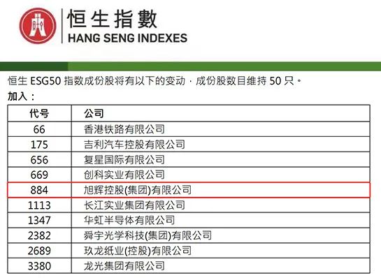 近日,恒生指数有限公司宣布将更新恒生ESG50指数成份股名单,评选出ESG整体表现最好的五十家较大型上市公司,旭辉控股集团(00884.HK)首次获纳入该指数。