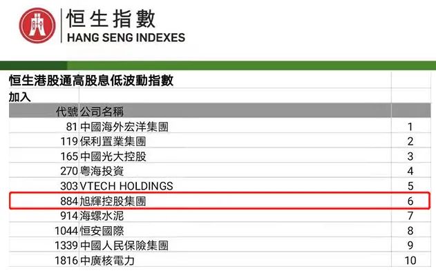 值得一提的是,旭辉在同一时间还入选恒生港股通高股息低波动指数,该指数旨在追踪内地投资者经港股通买卖的前50只高股息低波动上市公司表现。